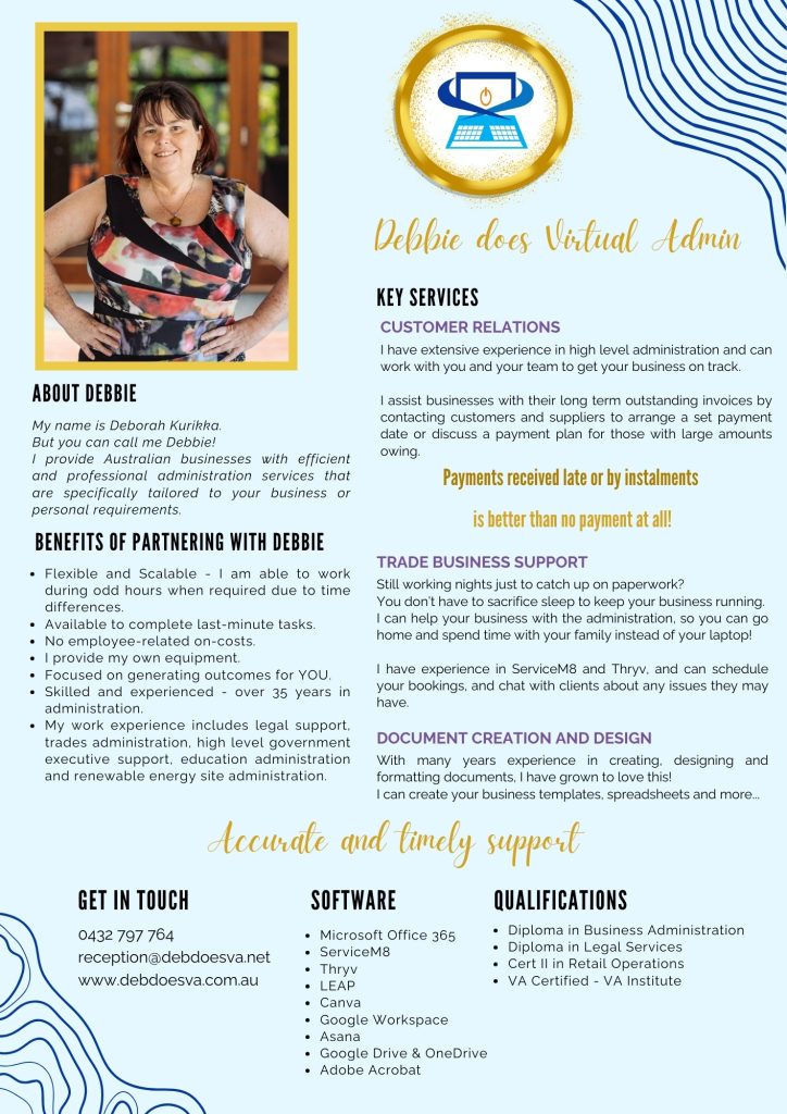 With more than 35 years of experience in administration and executive support, Debbie Does Virtual Administration is the helping hand many small businesses didn’t know they needed. Debbie specialises in keeping your calendar in order, organising emails, managing documents, and handling the behind-the-scenes tasks that free up your time to focus on what really matters – growing your business.