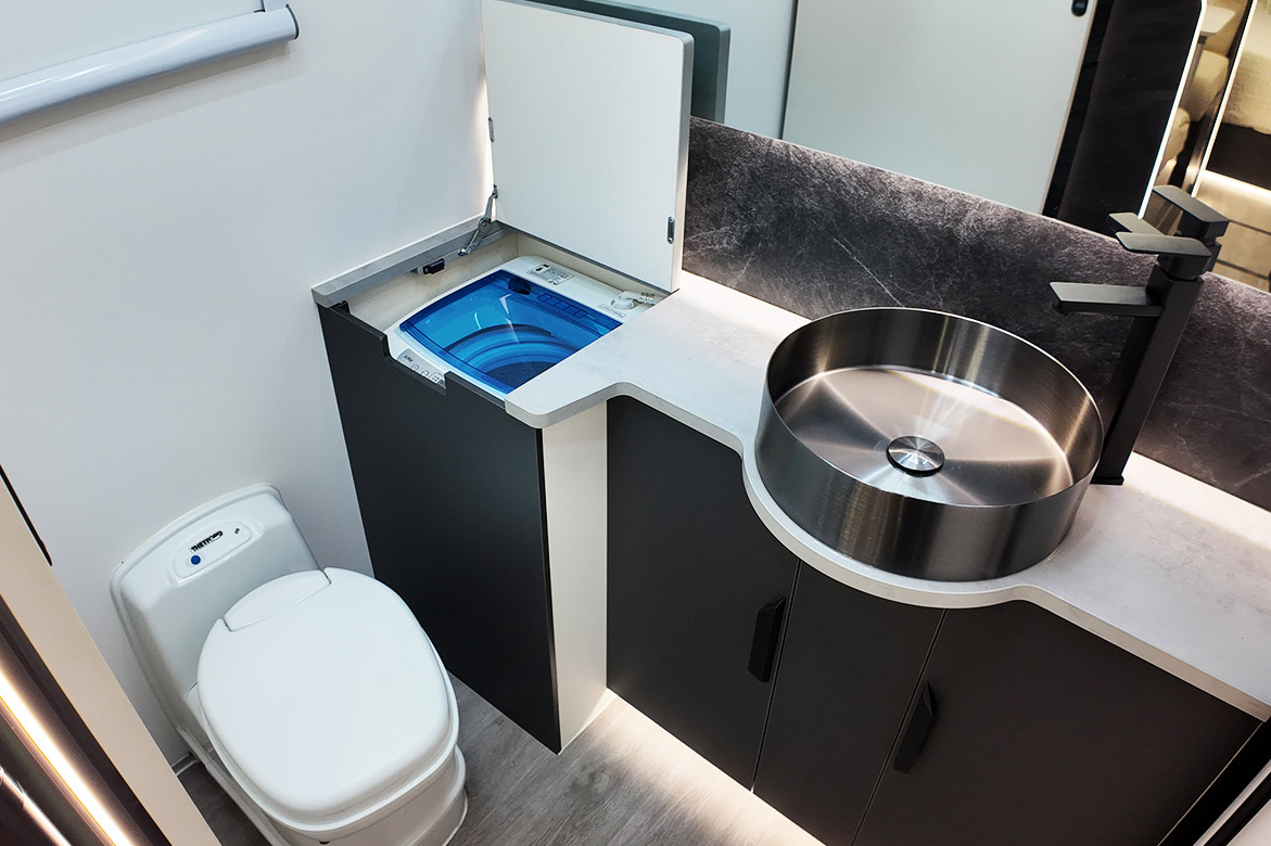 When it is time to relax or sit down for a meal, the leather cafe lounge offers a touch of luxury at the heart of a well-designed interior. The bathroom setup continues the theme of practicality, with a toilet, shower, and basin included as standard, while larger models even feature an inbuilt washing machine, a game-changer for longer trips.