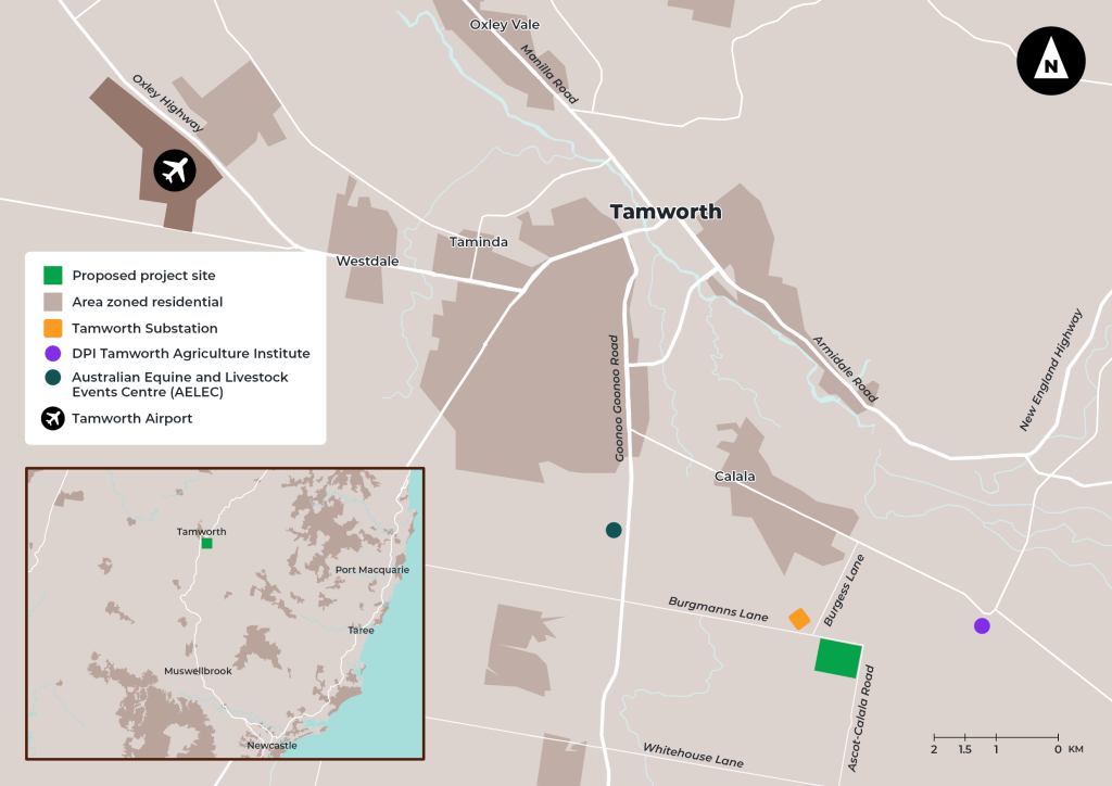 The proposed 270-megawatt/1,080-megawatt-hour Kingswood Battery Energy Storage System (BESS) is located approximately six kilometres southeast of Tamworth on an 8-hectare site at 744 Burgmanns Lane, Kingswood. The project is proposed by the Australian subsidiary of Spanish company Iberdrola.