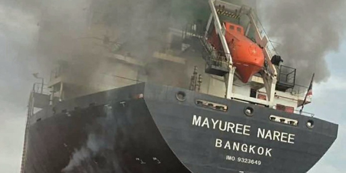 Two projectiles of unknown origin struck the Thai-flagged Mayuree Naree dry bulk vessel as it sailed through the strait earlier on Wednesday, causing a fire and damaging the engine room, operator Precious Shipping said.