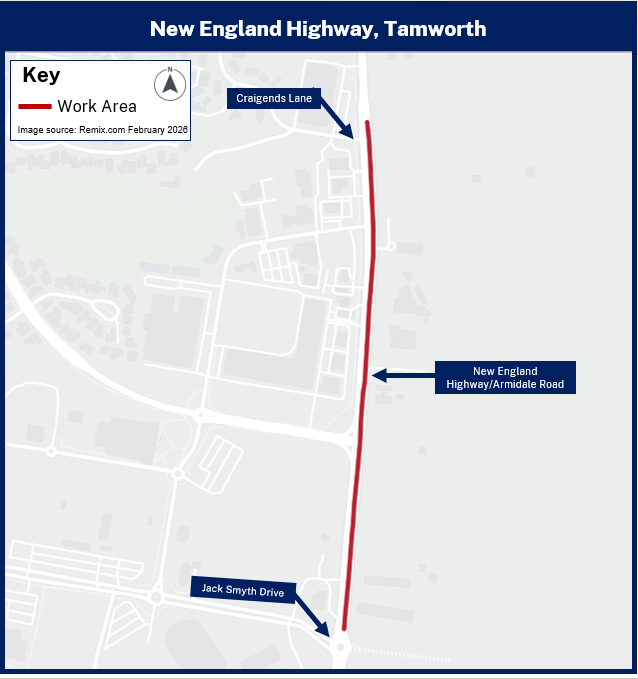 Motorists in Tamworth and Hillvue are advised of changed overnight traffic conditions this weekend on the New England Highway between Craigends Lane and Jack Smyth Drive for maintenance work.