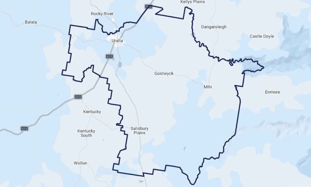 Uralla Shire is divided into two wards. Ward A includes the Uralla township and surrounding areads to the south including Gostwyck, Mihi and Salisbury Plains.