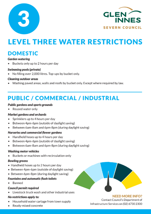 Residents can check current restrictions and permitted water use on the council website or by contacting Glen Innes Severn Council.
