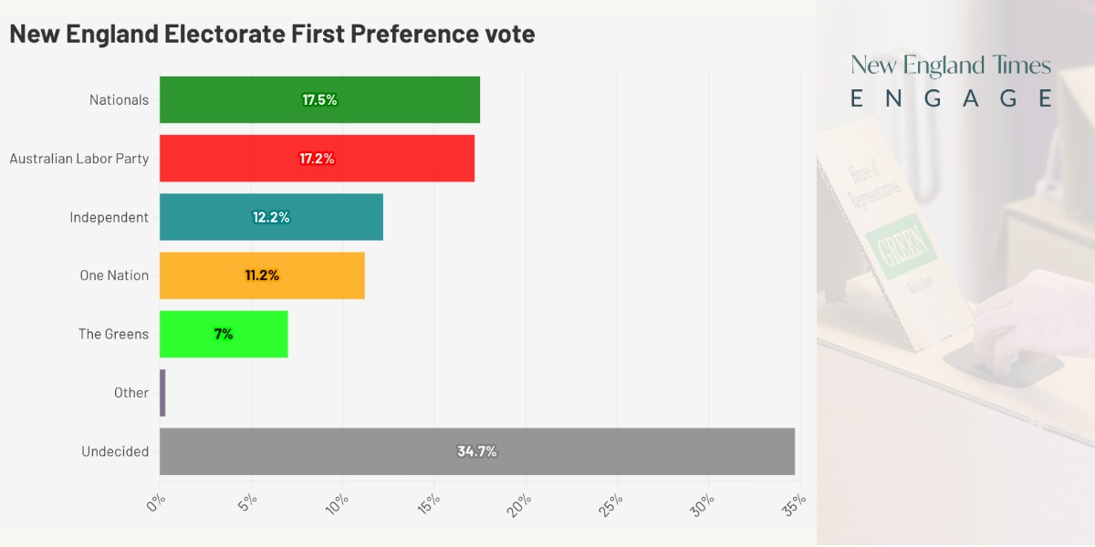 More than a third of New England voters say they are undecided about who they would support at the next federal election, with the latest New England Times Engage Poll revealing an electorate unsettled by Barnaby Joyce’s move to One Nation.
