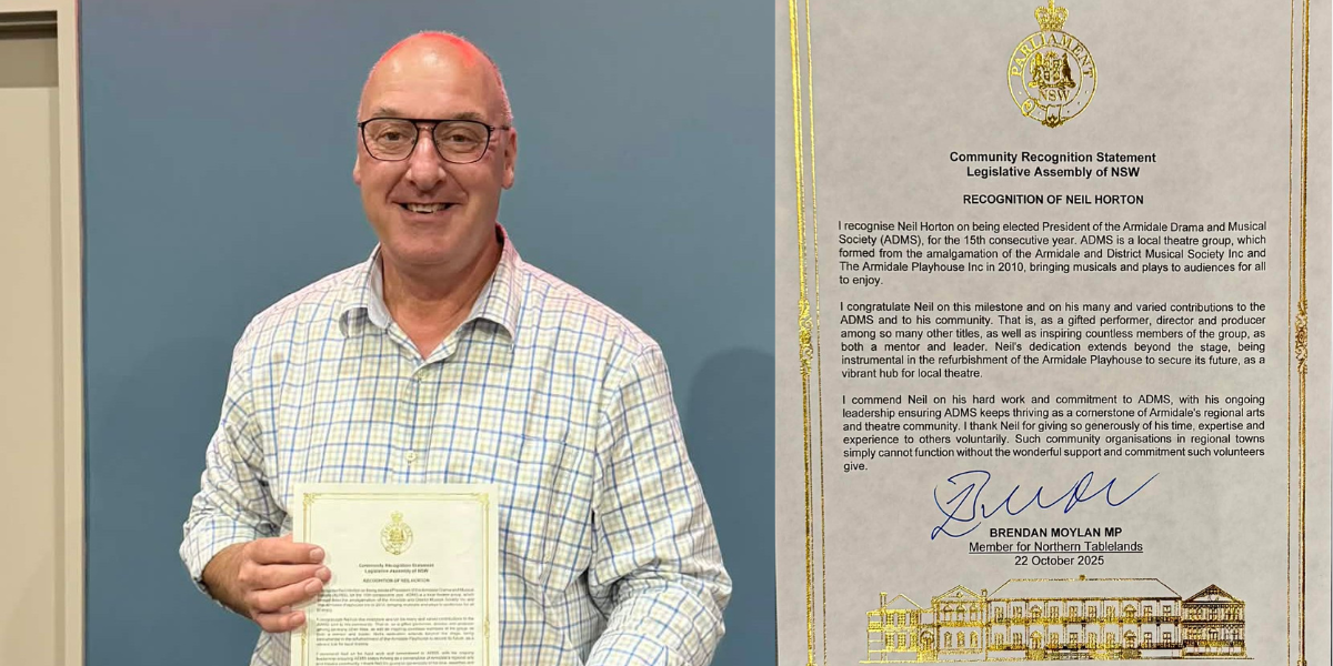 The Armidale Drama and Music Society (ADMS) recently took a moment to honour a stalwart of the local arts community: longtime President Neil Horton, who has just celebrated an incredible 15 years of leadership at the helm of the organisation.